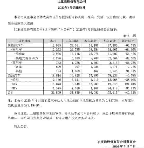 據比亞迪近期向股東披露的4月銷量快報顯示,比亞迪今年4月新能源乘用車型的銷量為12262輛,環比銷量大幅驟減,較去年同期下降63.79%。其中,純電動車型占據銷量大頭,為9966輛;而插電式混合動力車型則為2296輛。