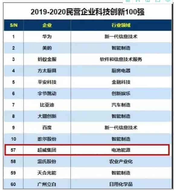 超威躋身中國輕工業百強榜,科技百強榜前十