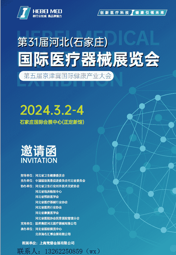 主辦單位:中國國際貿易促進委員會河北省委員會協辦單位:河北省衛生行業對外技術交流協會、河北省臨床檢驗中心、河北省預防醫學會、河北省醫療器械行業協會、河北省醫藥行業協會、河北省康復醫學會、河北省醫院協會民營醫院管理分會